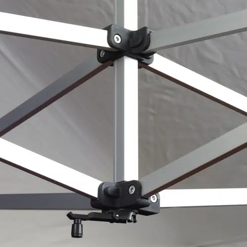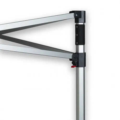 La estructura de esta carpa está fabricada con tramos tubulares hexagonales de aluminio de 40 mm, garantizando una gran estabilidad y resistencia. Las patas están compuestas por tubos internos y externos, lo que refuerza su solidez. Además, las barras cruzadas internas tienen refuerzos adicionales para mejorar la resistencia frente a vientos y otras condiciones climáticas. Su color gris metalizado mate le da un aspecto profesional y elegante, perfecto para cualquier tipo de evento corporativo, deportivo o promocional.