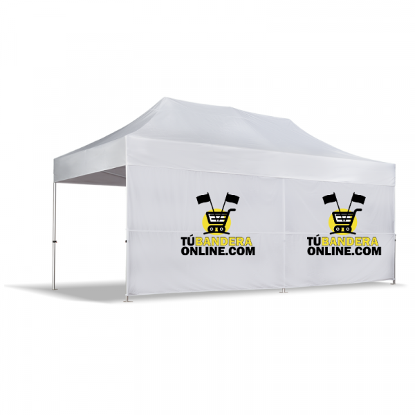 Pared para carpa 6×1,9m con tela bandera (115 g/m2) o con tela impermeable (250 g/m2), impresa a una cara, sujeta al techo y a las patas con velcro por ambos lados para poder colocar la impresión hacia dentro o fuera. Las paredes se venden individualmente.