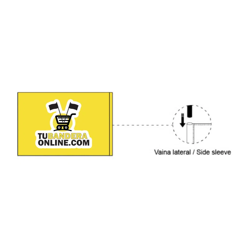 Bandera horizontal en poliéster 115 g/m² con vaina cerrada para palo, impresión por sublimación y acabados reforzados. Personalizable en medidas y diseño.