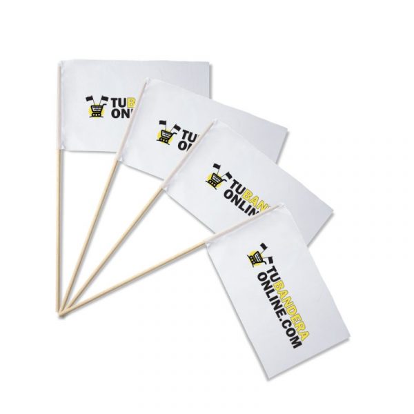 Las banderas con palo están pensadas como un elemento individual para que cada asistente pueda expresar su reivindicación y su pertenencia a un movimiento. Favorecen que el colectivo en su conjunto llame la atención por su protesta. Su principal ventaja es que son muy baratas. Las banderas con palo están fabricadas en tejido de poliéster de 115 g/m². Tienen una vaina lateral en la que se inserta el palo de madera. Cada bandera incluye un palo de madera pulido de 1,2 cm de diámetro. Dispone de 5 modelos según tamaño a elegir.