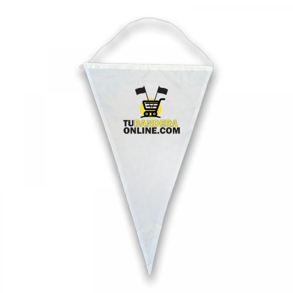 Banderín triangular de 50cm y 80cm con cuerda. Impresión a una cara con tu diseño. Elaborado en tela 100% poliéster de 115g/m², con cosido perimetral. Su uso está recomendado tanto para interior como para exterior.