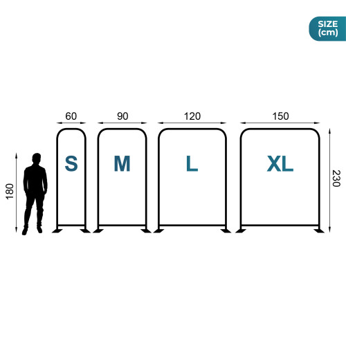 El Wall Banner está disponible en varios tamaños (S, M, L y XL), todos con una altura estándar de 230 cm, para adaptarse a las distintas necesidades de exposición. Desde pequeñas zonas de atención al cliente hasta amplios stands de ferias, siempre hay una medida adecuada para cada tipo de evento o espacio interior.